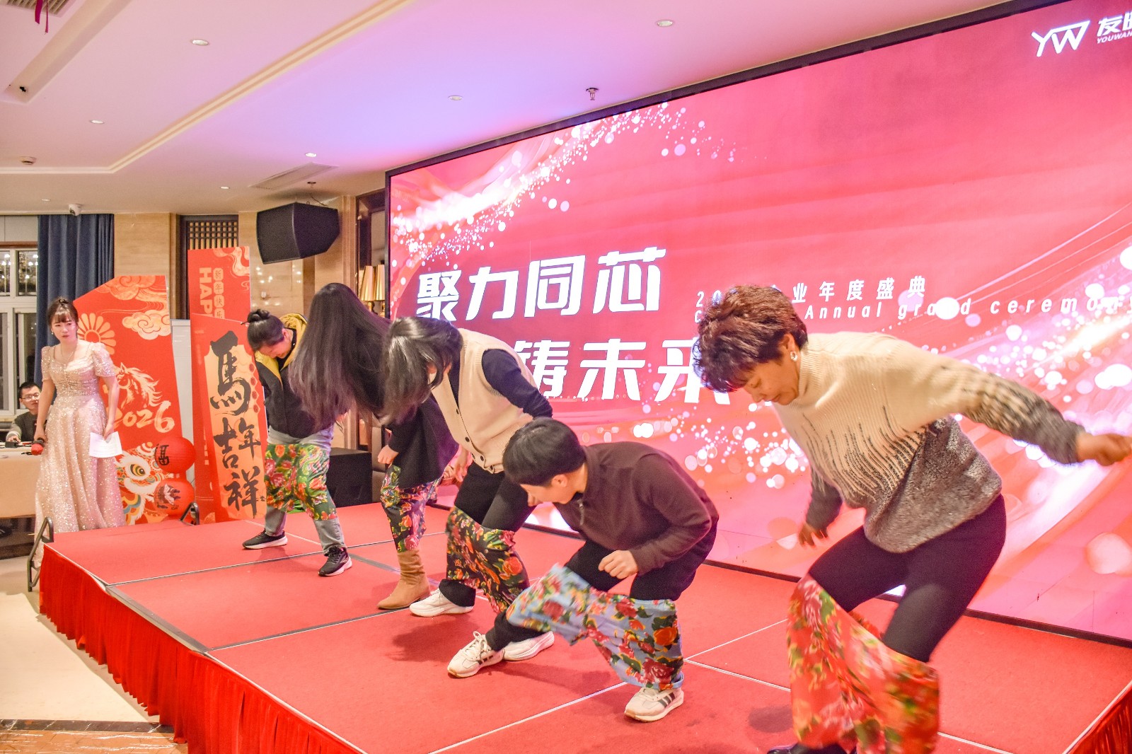 互动游戏环节则彻底点燃了全场的欢笑与活力。在“蒙眼吸可乐”的挑战中,参与者戴着眼罩,摸索进行,滑稽的动作与出人意料的结局引得掌声与笑声不断。而“徒手穿大花裤”更是将气氛推向爆点,参与者们手忙脚乱地套上鲜艳夺目的花裤,比拼速度与灵活度,造型百出、妙趣横生,台上台下笑成一片。这些轻松愉快的游戏穿插于晚宴与抽奖之间,让大家在享受美味佳肴的同时,尽情放松,沉浸于欢乐的海洋。