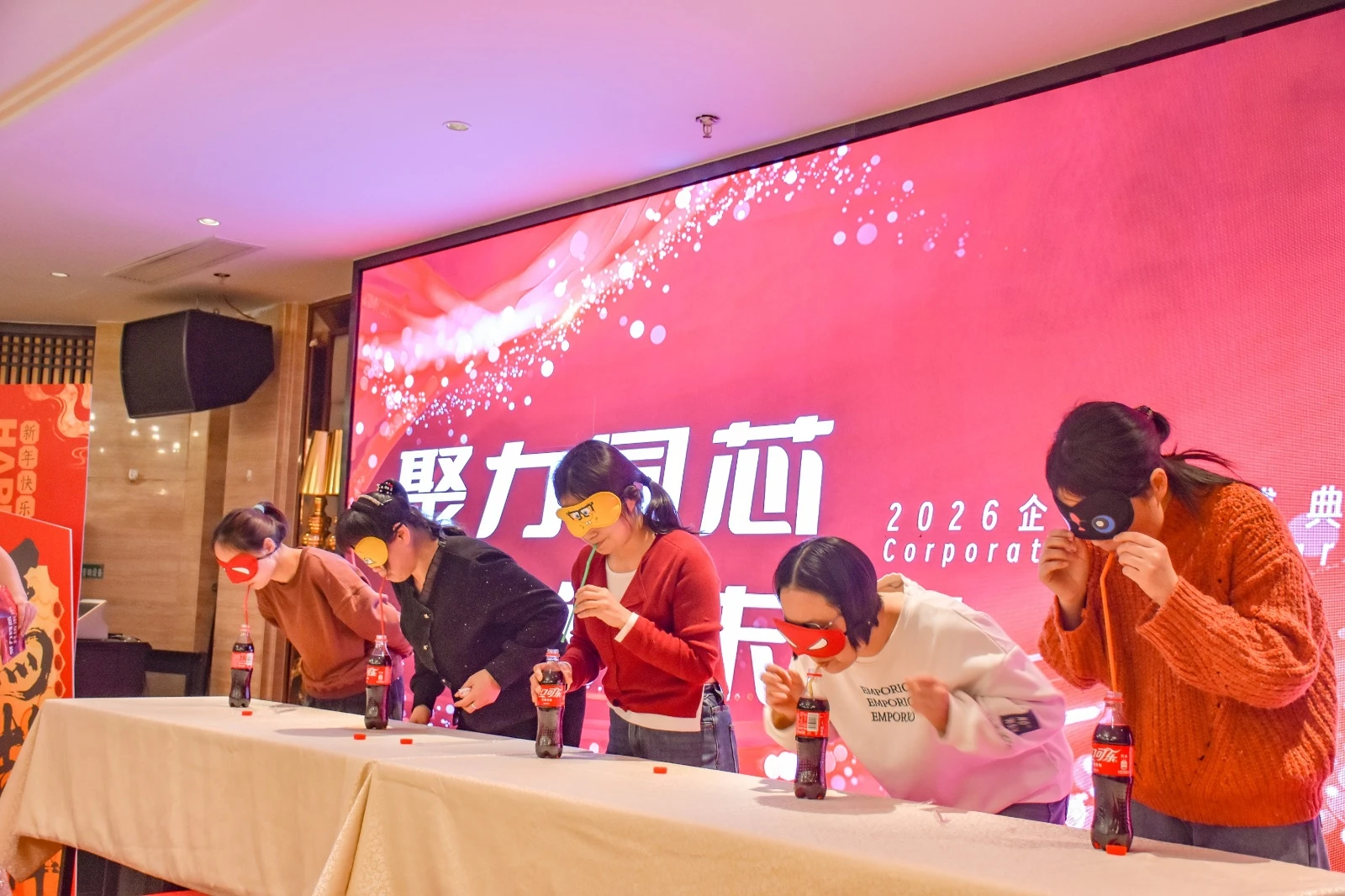 互动游戏环节则彻底点燃了全场的欢笑与活力。在“蒙眼吸可乐”的挑战中,参与者戴着眼罩,摸索进行,滑稽的动作与出人意料的结局引得掌声与笑声不断。而“徒手穿大花裤”更是将气氛推向爆点,参与者们手忙脚乱地套上鲜艳夺目的花裤,比拼速度与灵活度,造型百出、妙趣横生,台上台下笑成一片。这些轻松愉快的游戏穿插于晚宴与抽奖之间,让大家在享受美味佳肴的同时,尽情放松,沉浸于欢乐的海洋。