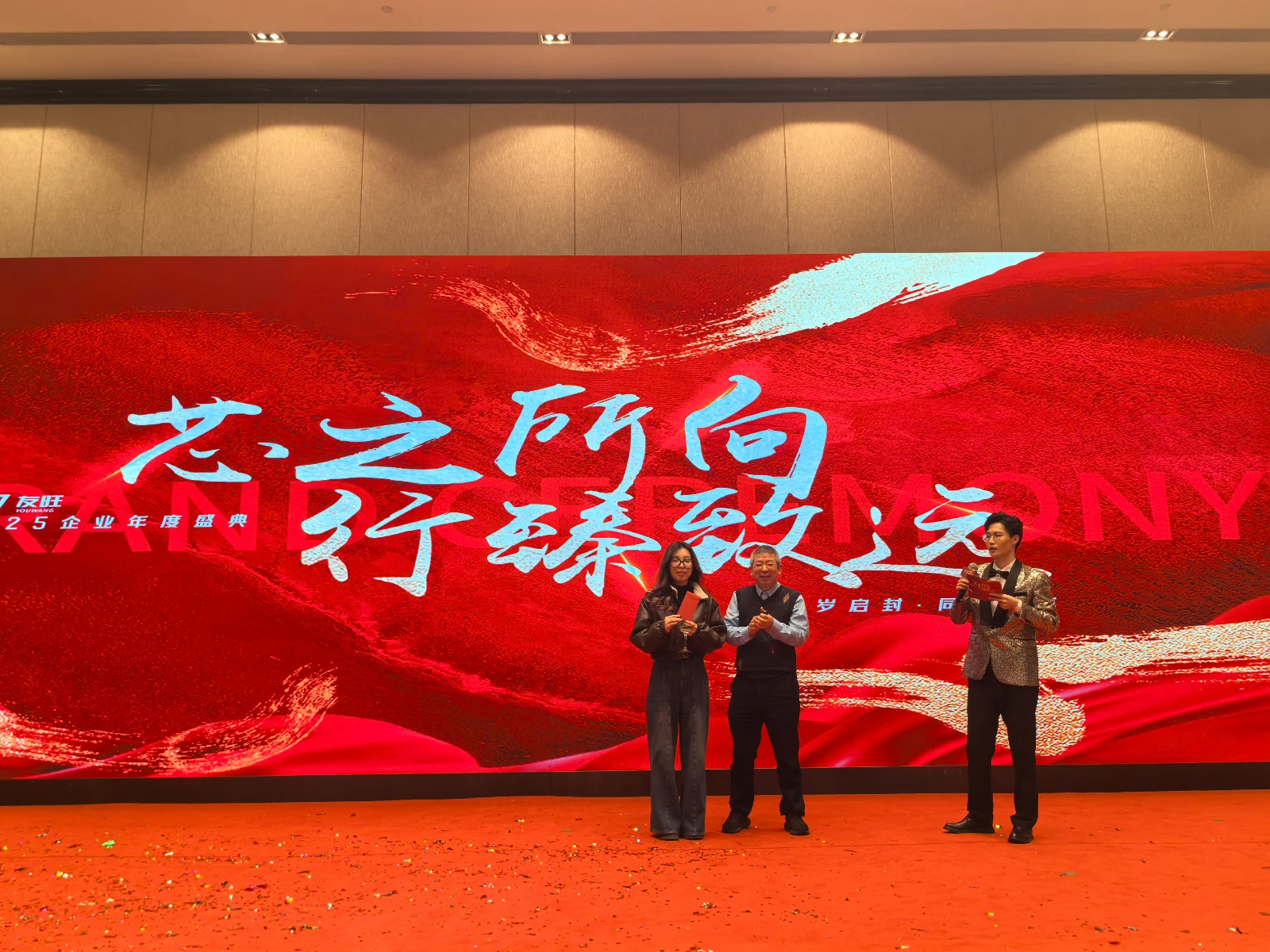 本次年会分为联欢会和晚宴两个部分。15:08,随着激昂的鼓点响起,一场别开生面的舞狮表演准时上演,瞬间点燃了现场的气氛。随后主持人热情开场,拉开了联欢会帷幕。